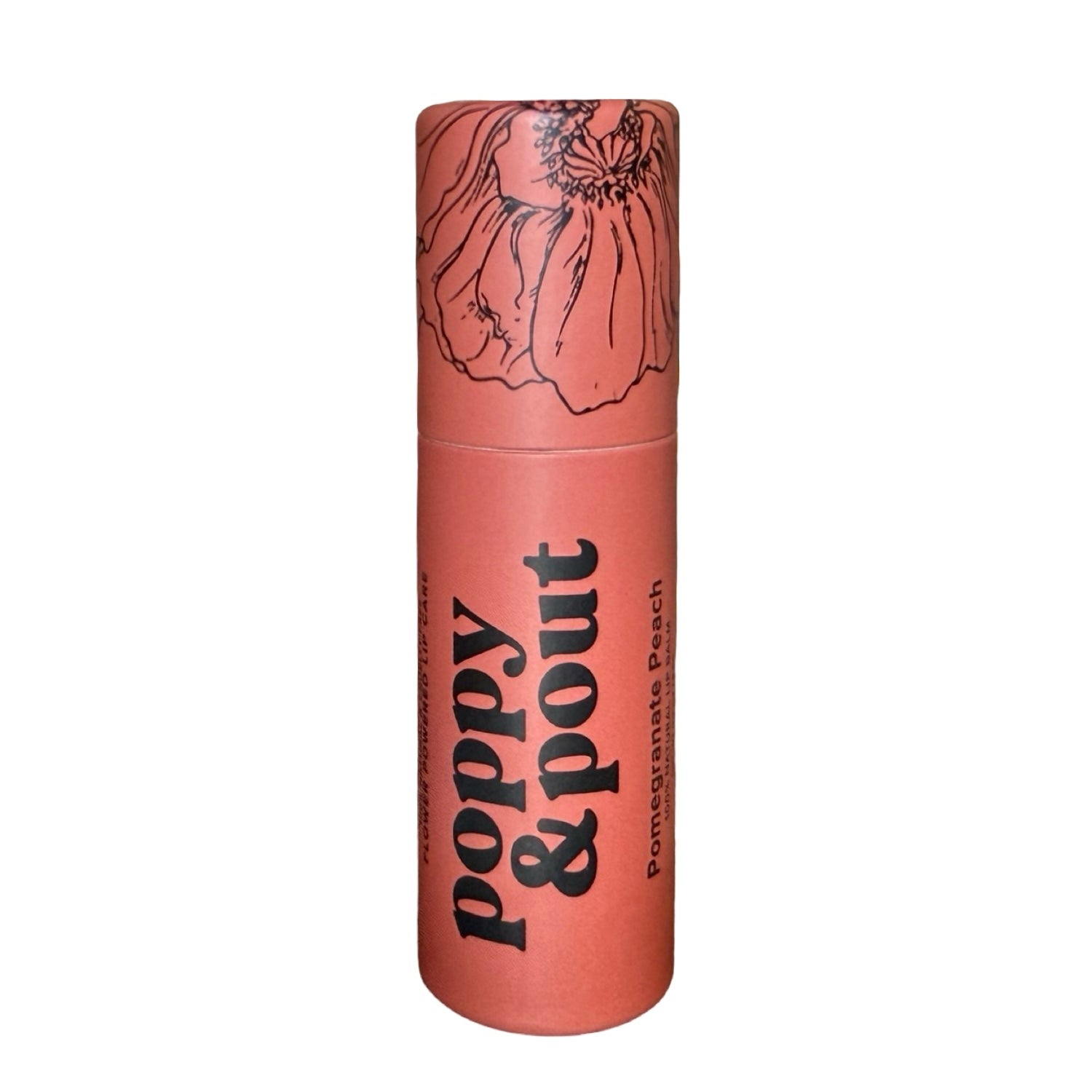 Tube of lip balm labeled “poppy & pout” with matching cap.